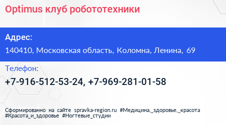 Optimus, клуб робототехники по адресу 140410, Московская область, Коломна, Ленина, 69 в дальнейшем Организация, размещена в следующих категориях: