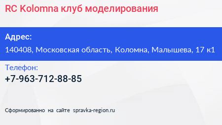 RC Kolomna, клуб моделирования по адресу 140408, Московская область, Коломна, Малышева, 17 к1 в дальнейшем Организация, размещена в следующих категориях: