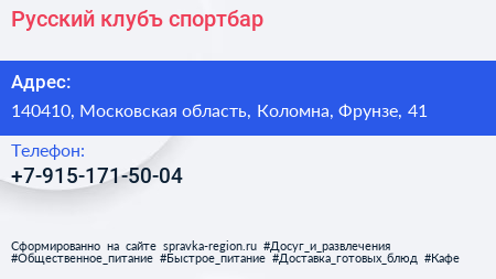 Русский клубъ, спортбар по адресу 140410, Московская область, Коломна, Фрунзе, 41 в дальнейшем Организация, размещена в следующих категориях:
