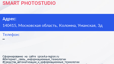 SMART PHOTOSTUDIO по адресу 140415, Московская область, Коломна, Уманская, 3д в дальнейшем Организация, размещена в следующих категориях: