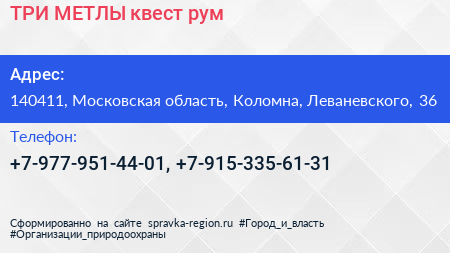ТРИ МЕТЛЫ, квест-рум по адресу 140411, Московская область, Коломна, Леваневского, 36 в дальнейшем Организация, размещена в следующих категориях: