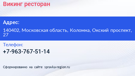 Викинг, ресторан по адресу 140402, Московская область, Коломна, Окский проспект, 27 в дальнейшем Организация, размещена в следующих категориях: