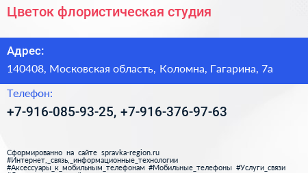 Цветок, флористическая студия по адресу 140408, Московская область, Коломна, Гагарина, 7а в дальнейшем Организация, размещена в следующих категориях: