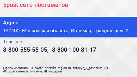 5post, сеть постаматов по адресу 140400, Московская область, Коломна, Гражданская, 2 в дальнейшем Организация, размещена в следующих категориях: