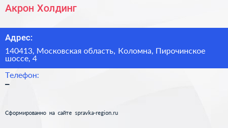 Акрон Холдинг по адресу 140413, Московская область, Коломна, Пирочинское шоссе, 4 в дальнейшем Организация, размещена в следующих категориях:
