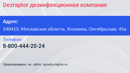 Dezraptor, дезинфекционная компания по адресу 140413, Московская область, Коломна, Октябрьская, 45а в дальнейшем Организация, размещена в следующих категориях: