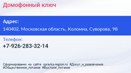 Домофонный ключ по адресу 140402, Московская область, Коломна, Суворова, 98 в дальнейшем Организация, размещена в следующих категориях: