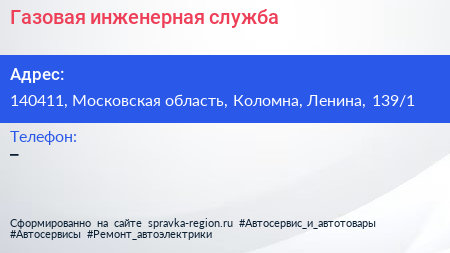 Газовая инженерная служба по адресу 140411, Московская область, Коломна, Ленина, 139/1 в дальнейшем Организация, размещена в следующих категориях: