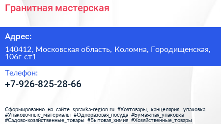 Гранитная мастерская по адресу 140412, Московская область, Коломна, Городищенская, 106г ст1 в дальнейшем Организация, размещена в следующих категориях: