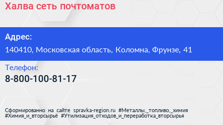 Халва, сеть почтоматов по адресу 140410, Московская область, Коломна, Фрунзе, 41 в дальнейшем Организация, размещена в следующих категориях: