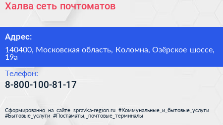Халва, сеть почтоматов по адресу 140400, Московская область, Коломна, Озёрское шоссе, 19а в дальнейшем Организация, размещена в следующих категориях: