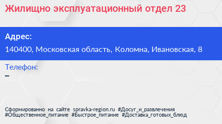 Жилищно-эксплуатационный отдел №23 по адресу 140400, Московская область, Коломна, Ивановская, 8 в дальнейшем Организация, размещена в следующих категориях: