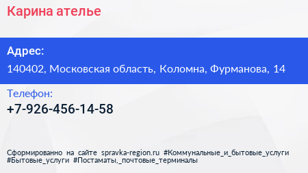 Карина, ателье по адресу 140402, Московская область, Коломна, Фурманова, 14 в дальнейшем Организация, размещена в следующих категориях: