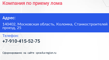 Компания по приему лома по адресу 140402, Московская область, Коломна, Станкостроителей проезд, 25 в дальнейшем Организация, размещена в следующих категориях: