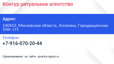 Контур, ритуальное агентство по адресу 140412, Московская область, Коломна, Городищенская, 106г ст1 в дальнейшем Организация, размещена в следующих категориях: