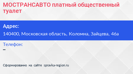 МОСТРАНСАВТО, платный общественный туалет по адресу 140400, Московская область, Коломна, Зайцева, 46а в дальнейшем Организация, размещена в следующих категориях: