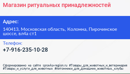Магазин ритуальных принадлежностей по адресу 140413, Московская область, Коломна, Пирочинское шоссе, вл4а ст1 в дальнейшем Организация, размещена в следующих категориях: