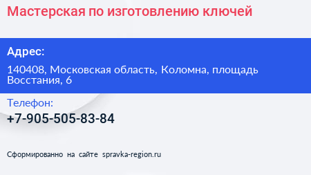 Мастерская по изготовлению ключей по адресу 140408, Московская область, Коломна, площадь Восстания, 6 в дальнейшем Организация, размещена в следующих категориях: