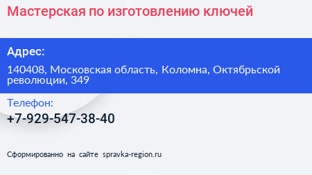 Мастерская по изготовлению ключей по адресу 140408, Московская область, Коломна, Октябрьской революции, 349 в дальнейшем Организация, размещена в следующих категориях: