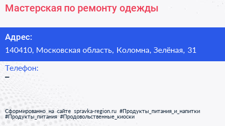 Мастерская по ремонту одежды по адресу 140410, Московская область, Коломна, Зелёная, 31 в дальнейшем Организация, размещена в следующих категориях: