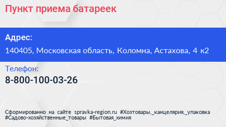 Пункт приема батареек по адресу 140405, Московская область, Коломна, Астахова, 4 к2 в дальнейшем Организация, размещена в следующих категориях: