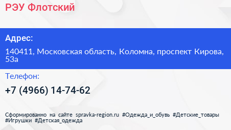 РЭУ Флотский по адресу 140411, Московская область, Коломна, проспект Кирова, 53а в дальнейшем Организация, размещена в следующих категориях: