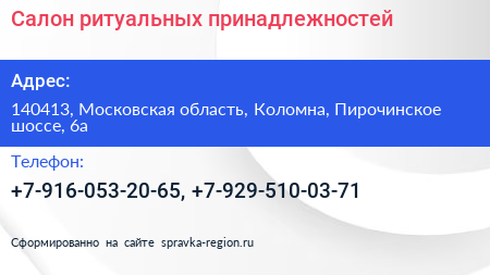 Салон ритуальных принадлежностей по адресу 140413, Московская область, Коломна, Пирочинское шоссе, 6а в дальнейшем Организация, размещена в следующих категориях: