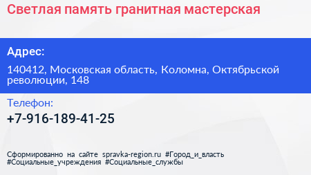 Светлая память, гранитная мастерская по адресу 140412, Московская область, Коломна, Октябрьской революции, 148 в дальнейшем Организация, размещена в следующих категориях: