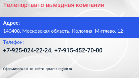 Телепортавто, выездная компания по адресу 140408, Московская область, Коломна, Митяево, 12 в дальнейшем Организация, размещена в следующих категориях: