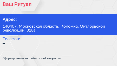 Ваш Ритуал по адресу 140407, Московская область, Коломна, Октябрьской революции, 318а в дальнейшем Организация, размещена в следующих категориях: