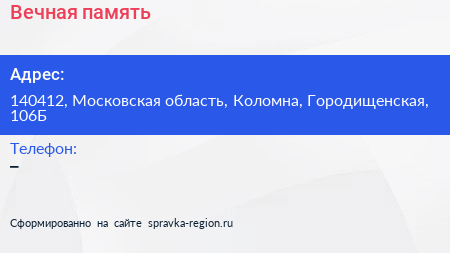 Вечная память по адресу 140412, Московская область, Коломна, Городищенская, 106Б в дальнейшем Организация, размещена в следующих категориях: