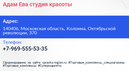 Адам & Ева, студия красоты по адресу 140406, Московская область, Коломна, Октябрьской революции, 370 в дальнейшем Организация, размещена в следующих категориях: