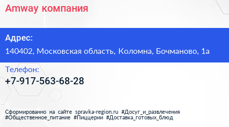 Amway, компания по адресу 140402, Московская область, Коломна, Бочманово, 1а в дальнейшем Организация, размещена в следующих категориях: