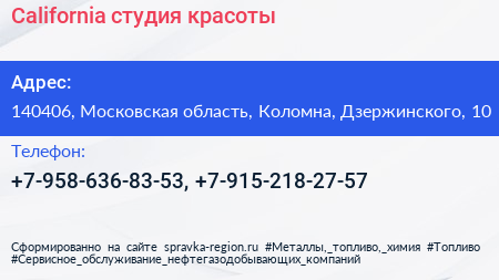 California, студия красоты по адресу 140406, Московская область, Коломна, Дзержинского, 10 в дальнейшем Организация, размещена в следующих категориях: