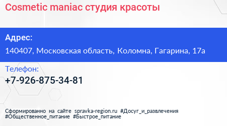 Cosmetic maniac, студия красоты по адресу 140407, Московская область, Коломна, Гагарина, 17а в дальнейшем Организация, размещена в следующих категориях:
