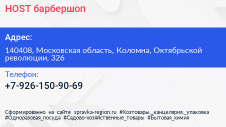 HOST, барбершоп по адресу 140408, Московская область, Коломна, Октябрьской революции, 326 в дальнейшем Организация, размещена в следующих категориях: