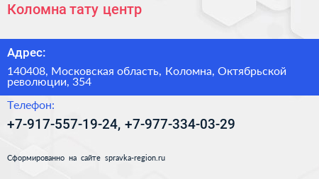 Коломна, тату-центр по адресу 140408, Московская область, Коломна, Октябрьской революции, 354 в дальнейшем Организация, размещена в следующих категориях:
