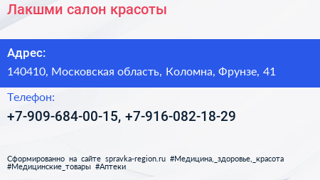 Лакшми, салон красоты по адресу 140410, Московская область, Коломна, Фрунзе, 41 в дальнейшем Организация, размещена в следующих категориях: