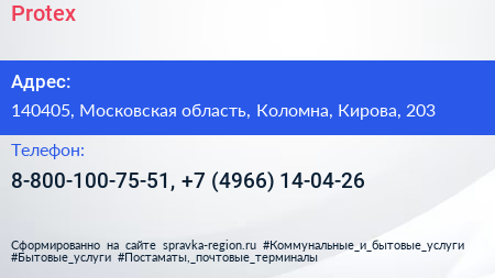 Protex по адресу 140405, Московская область, Коломна, Кирова, 203 в дальнейшем Организация, размещена в следующих категориях: