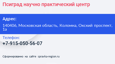 Псиград, научно-практический центр по адресу 140406, Московская область, Коломна, Окский проспект, 1а в дальнейшем Организация, размещена в следующих категориях:
