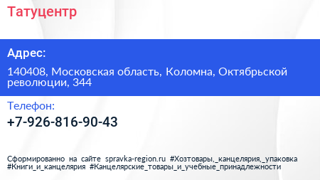 Татуцентр по адресу 140408, Московская область, Коломна, Октябрьской революции, 344 в дальнейшем Организация, размещена в следующих категориях: