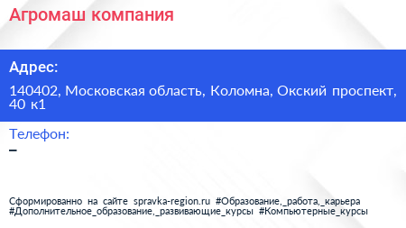 Агромаш, компания по адресу 140402, Московская область, Коломна, Окский проспект, 40 к1 в дальнейшем Организация, размещена в следующих категориях: