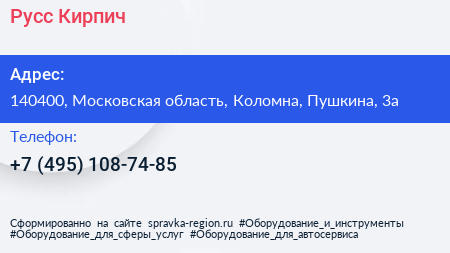 Русс Кирпич по адресу 140400, Московская область, Коломна, Пушкина, 3а в дальнейшем Организация, размещена в следующих категориях: