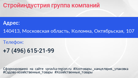 Стройиндустрия, группа компаний по адресу 140413, Московская область, Коломна, Октябрьская, 107 в дальнейшем Организация, размещена в следующих категориях: