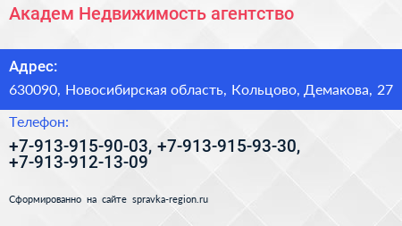 Академ-Недвижимость, агентство по адресу 630090, Новосибирская область, Кольцово, Демакова, 27 в дальнейшем Организация, размещена в следующих категориях: