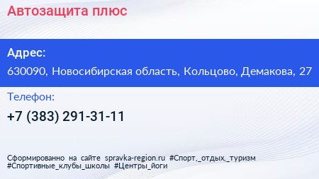 Автозащита плюс по адресу 630090, Новосибирская область, Кольцово, Демакова, 27 в дальнейшем Организация, размещена в следующих категориях: