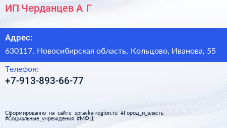 ИП Черданцев А.Г. по адресу 630117, Новосибирская область, Кольцово, Иванова, 55 в дальнейшем Организация, размещена в следующих категориях: