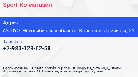 Sport & Ko, магазин по адресу 630090, Новосибирская область, Кольцово, Демакова, 23 в дальнейшем Организация, размещена в следующих категориях: