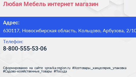 Любая Мебель, интернет-магазин по адресу 630117, Новосибирская область, Кольцово, Арбузова, 2/10 в дальнейшем Организация, размещена в следующих категориях: