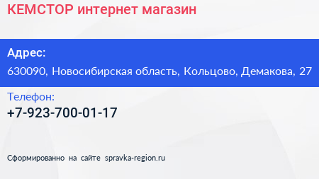 КЕМСТОР, интернет-магазин по адресу 630090, Новосибирская область, Кольцово, Демакова, 27 в дальнейшем Организация, размещена в следующих категориях: